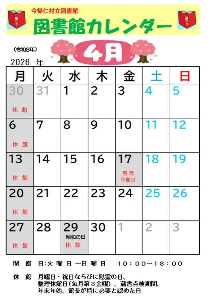 利用案内 2026(令和8)年 4月のカレンダー 2026(令和8)年 3月のカレンダー 2026(令和8年)2月のカレンダー 2026(令和8年)1月のカレンダー 2025(令和7)年12月のカレンダー 2025(令和7)年11月のカレンダー