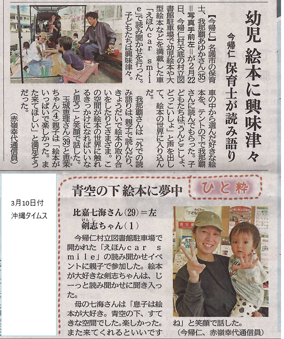 楽しかった本の読み語り 2026年4月16日 2月22日(日)に名護市の保育士、我那覇あゆかさんが 図書館駐車場で幼児絵本や大型絵本などを満載した 「えほんcar smile」で読み聞かせを行いました。